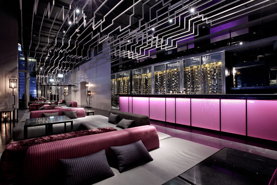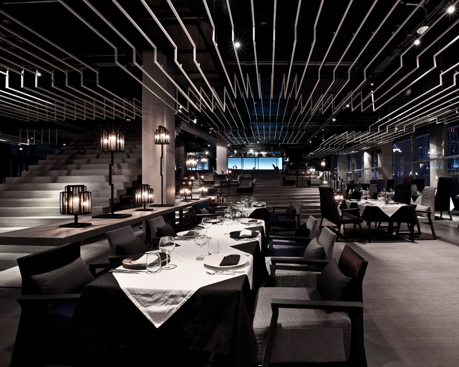 設計說明:波折線這個元素被頻繁的使用在空間中,樓梯,欄桿,座位,舞臺,燈飾,天花都有。天花上用的是波折的細鋼絲線,這些線條擋住了天花上的設備,并連同其它要素將空間變得活力,流動。室外的用餐涼亭也使用到波折線元素,其成為了空間內美麗天際線的獨特相框。時尚的元素,家具,裝修,圖案,讓這里充滿吸引力。