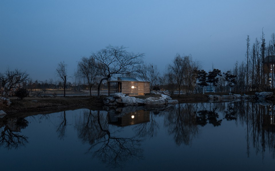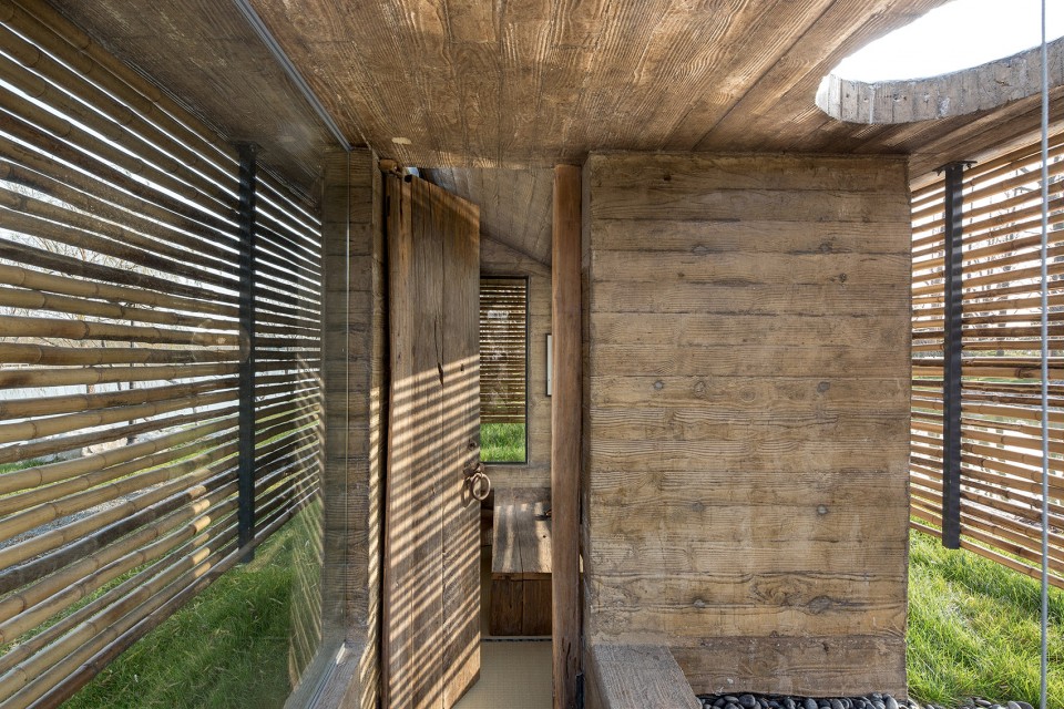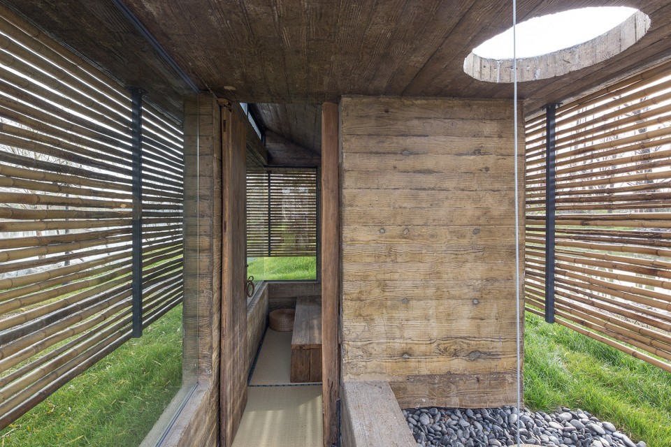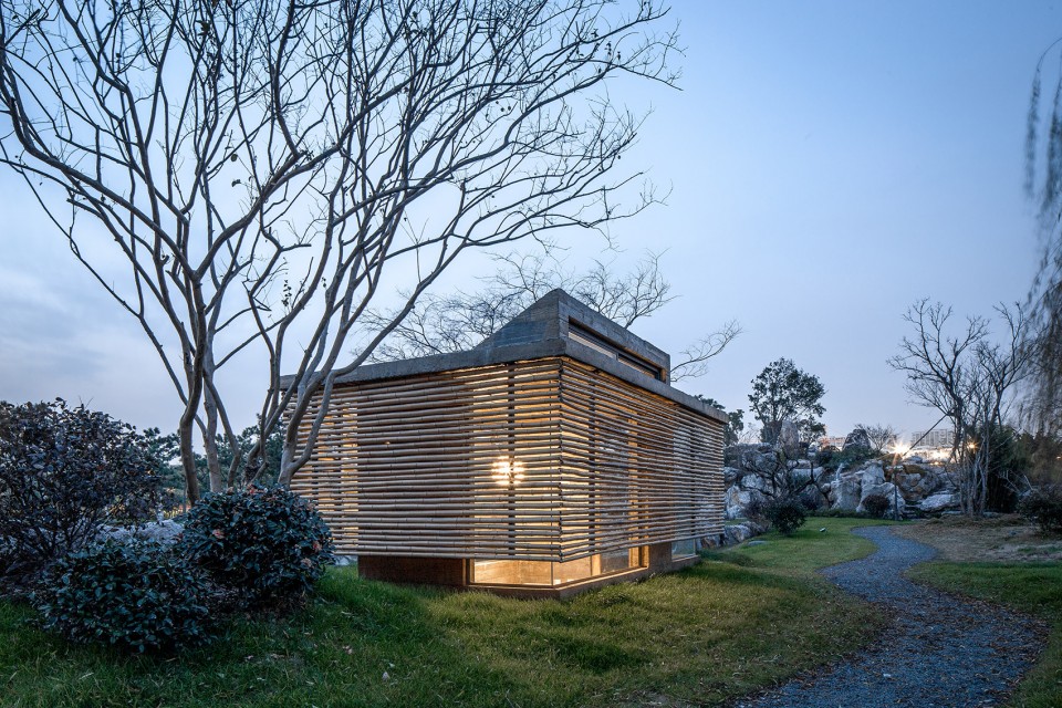 設計說明:該茶室由南京漢拓裝飾裝修設計。設計將傳統(tǒng)的中國古建筑坡屋頂?shù)男螒B(tài)簡化,中間起坡剛好形成東向通風高窗。木紋混凝土外表皮刷了清漆做保護,使得建成后的木紋混凝土擺脫了生水泥的顏色,顯得厚重。外掛竹百葉經(jīng)過水煮處理,顏色也趨近木紋混凝土最后的顏色。