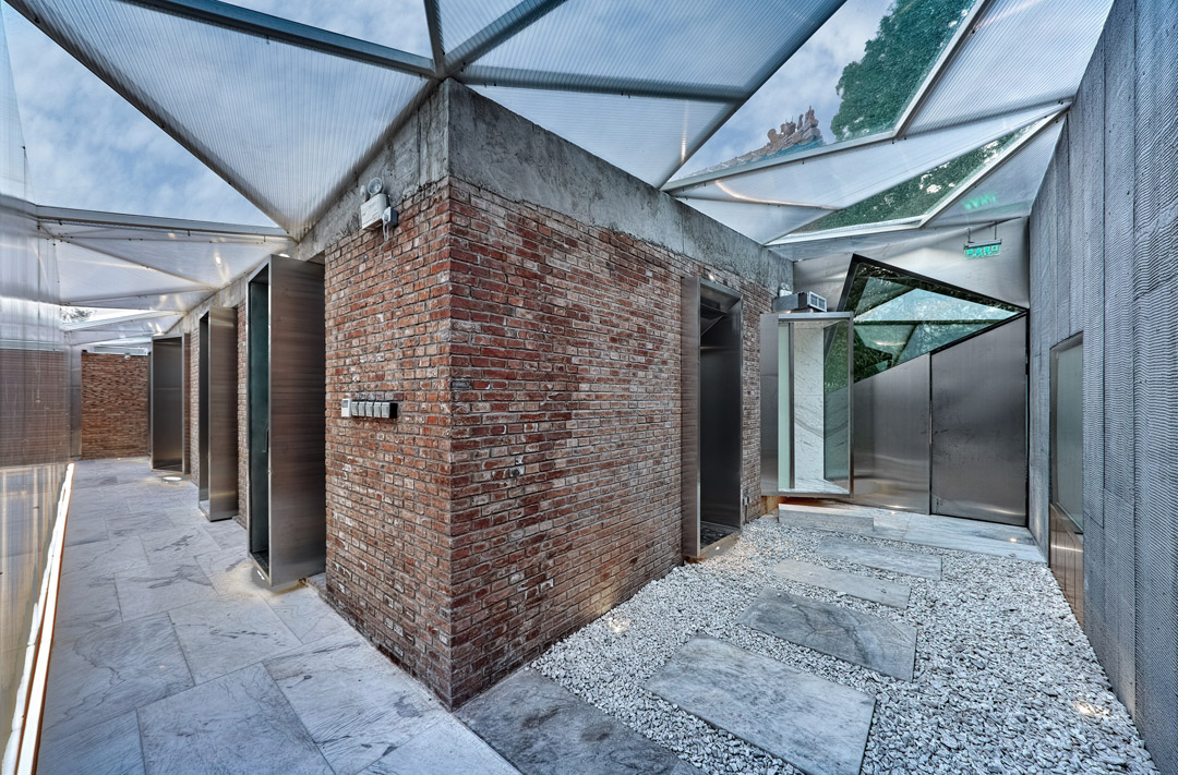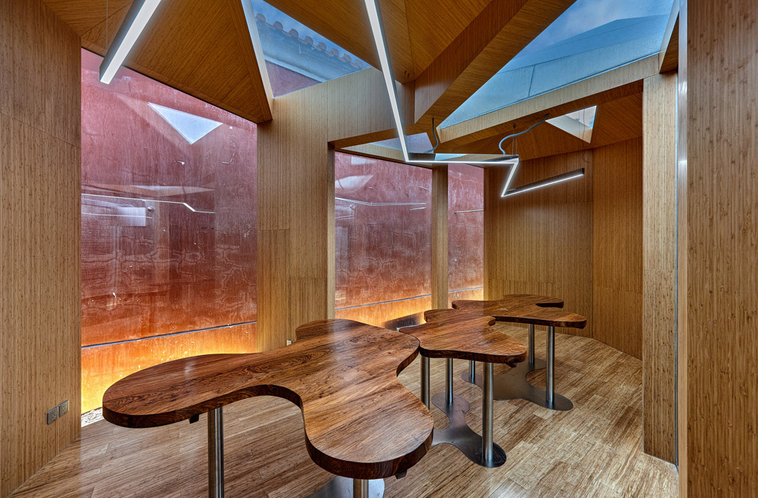 設(shè)計(jì)說明:茶室由七個(gè)獨(dú)特且獨(dú)立的房間組成。像城市中的細(xì)胞,雖然微小,卻能在城市中留下印記。在這樣一個(gè)特定的環(huán)境,我們所要表達(dá)的,正是這種過程。我們基本上保留了現(xiàn)有建筑的形態(tài),利用原有門窗洞口向內(nèi)生長,形成房子中的房子,作為更為私密的茶室,仿佛是新生的蘑菇。