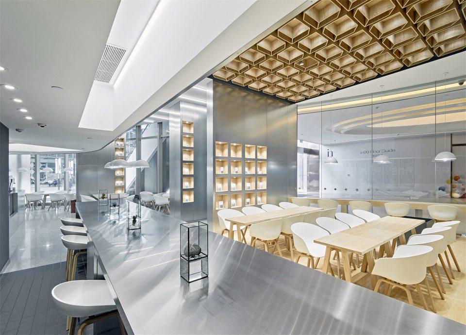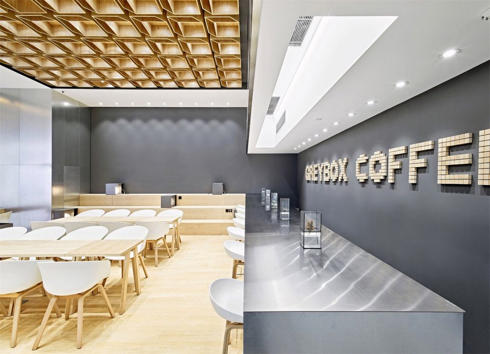 設(shè)計(jì)說明:設(shè)計(jì)師結(jié)合了業(yè)主的理念,試圖用設(shè)計(jì)的手法來制造一種“喝咖啡的儀式感”。不同于一般的咖啡廳那種濃烈的小資情調(diào),東緹咖啡廳是有自己的特殊企業(yè)理念的,東緹的負(fù)責(zé)人希望咖啡也能喝出儀式感,希望一杯咖啡,從開磨到?jīng)_泡到制作,到最終呈現(xiàn)在食客的面前,都是標(biāo)準(zhǔn)化的、工業(yè)化的、可視化的一個過程。做咖啡的過程就如同身處實(shí)驗(yàn)室,因此,漢拓設(shè)計(jì)師對于該咖啡廳的設(shè)計(jì)首先從燈光入手,并沒有采用其他咖啡廳昏暗燈光配慢搖的風(fēng)格,而是給予了明亮的射燈造型,讓制造咖啡的每一個過程都清晰無比的得以呈現(xiàn),也體現(xiàn)了企業(yè)標(biāo)準(zhǔn)化的訴求。