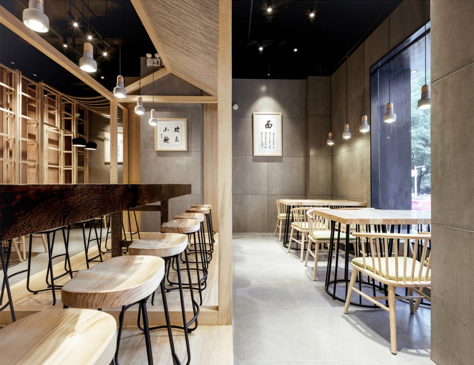 設(shè)計說明:該面館是由南京漢拓裝飾工程有限公司裝修的。與其他街頭面館不同,設(shè)計師對于這家面館的設(shè)計定位是比較高大上的,從同一著調(diào)的軟裝家具就能看出檔次。