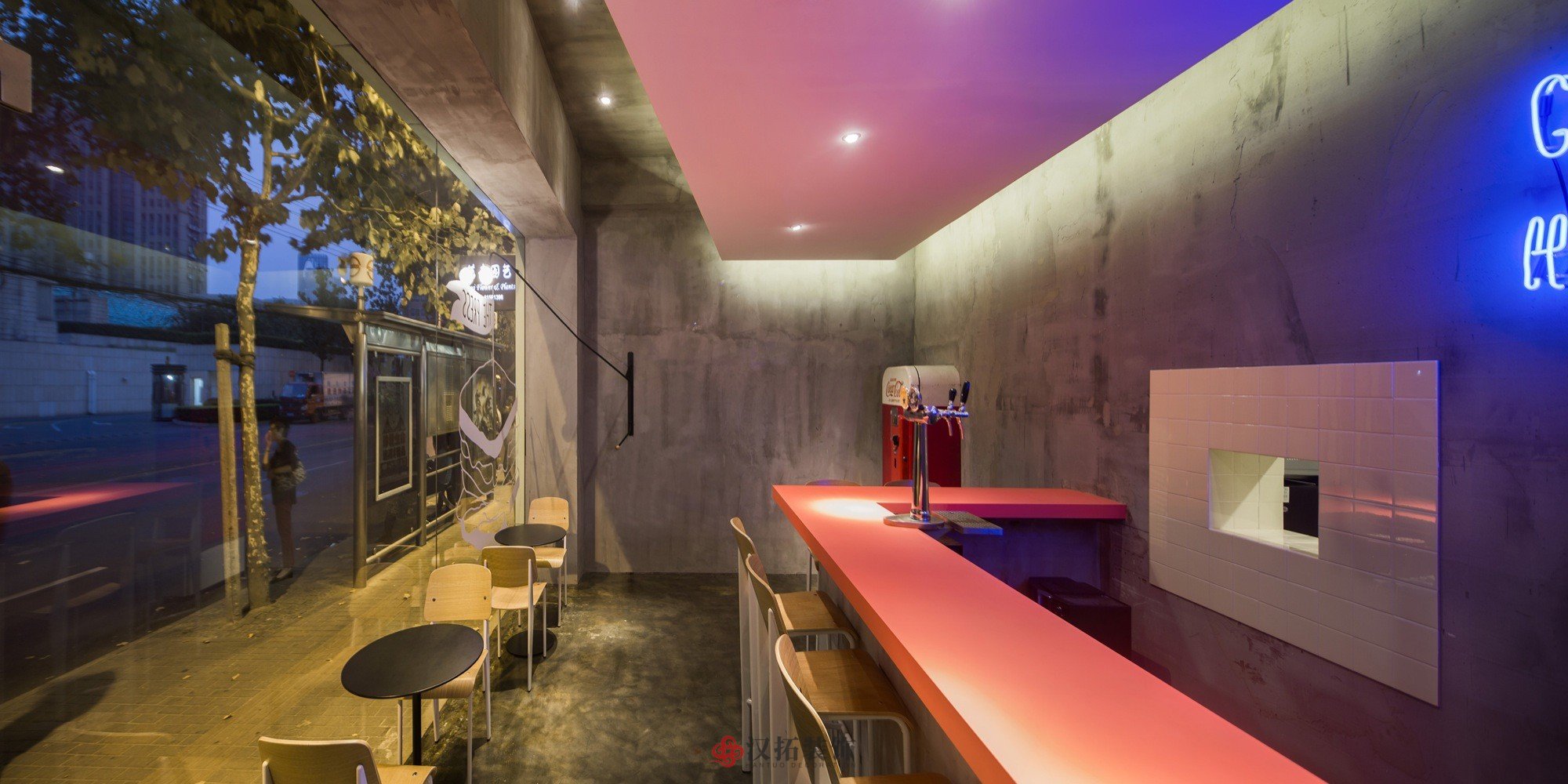 設(shè)計(jì)說明:本設(shè)計(jì)完成臺(tái)面色彩鮮艷的色調(diào),霓虹燈照明條和拋光極簡(jiǎn)主義的家具與未完成的墻壁,粗糙的混凝土墻壁和地板,加上不對(duì)稱的吊頂創(chuàng)建一個(gè)非傳統(tǒng)的場(chǎng)景,激發(fā)好奇心的空間。