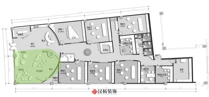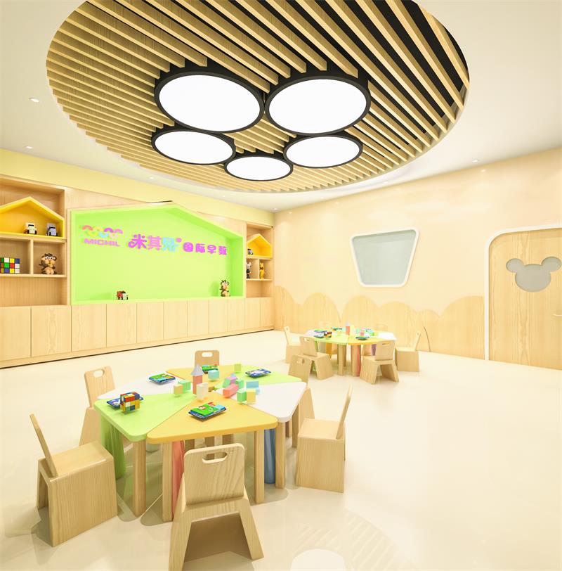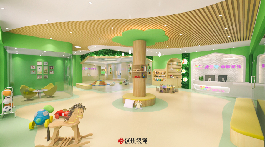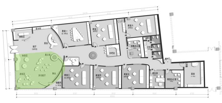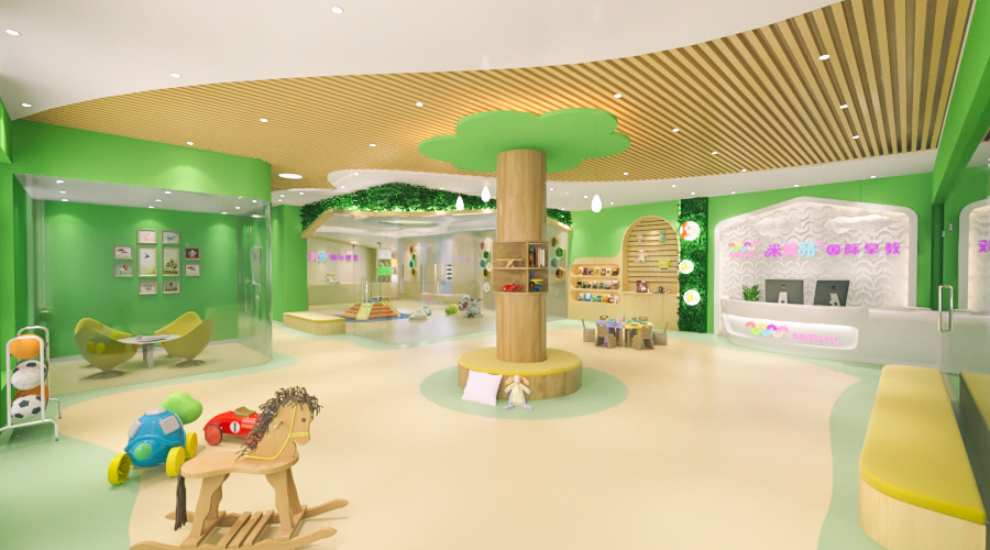 前廳120平,增加小舞臺(tái)區(qū),家長(zhǎng)或路過(guò)的群眾在門外就能看到園方的兒童或親子表演,增加人氣。我們把通道做成異形,擯棄傳統(tǒng)的方正規(guī)矩,顯得格外與眾不同,因?yàn)槭强偟?,?duì)空間是有一定要求的,一定要做到與其他園區(qū)的差異性,對(duì)品牌宣傳,對(duì)招生都是有利的。這點(diǎn)園長(zhǎng)也非常認(rèn)同我們,最終達(dá)成一致的合作意向。