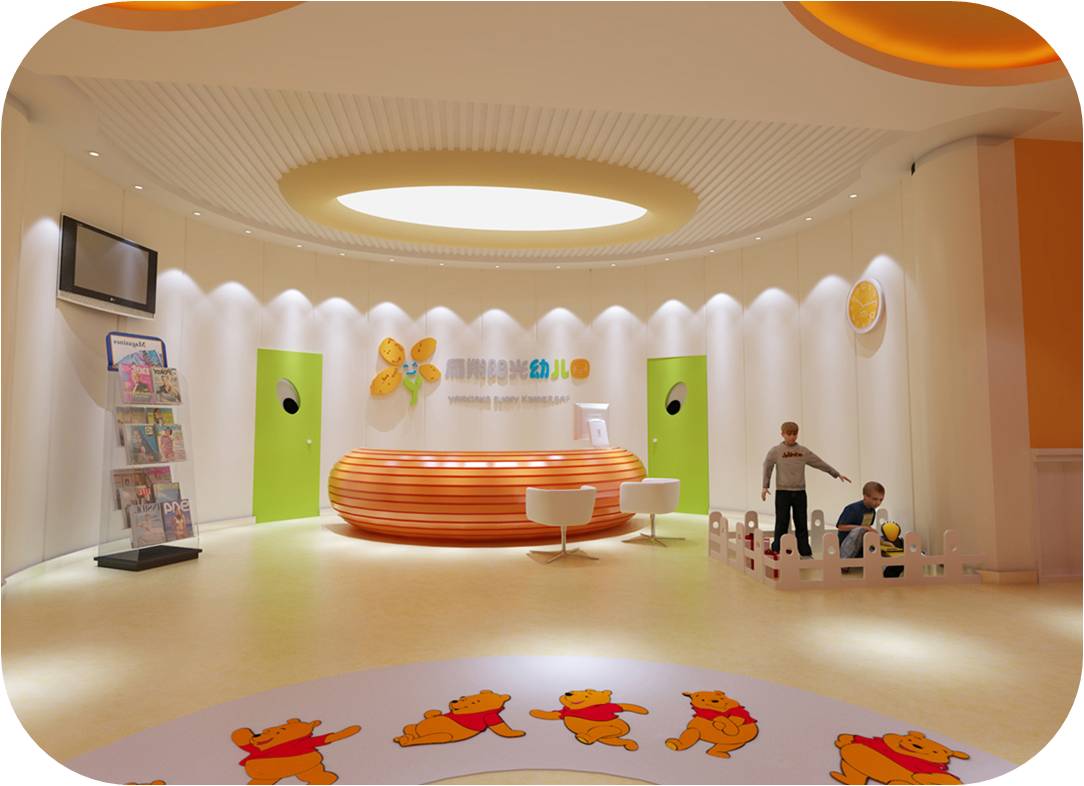 這是前廳,半圓形背景造型墻,墻面可做乳膠漆彩繪等等工藝,與之匹配的前臺(tái)做弧形造型,一方面為孩子安全考慮,另一方面與整體風(fēng)格一致,地面以地膠為主,暖色系地膠凸顯溫馨感,是耐磨好打理干凈衛(wèi)生的一種材質(zhì),非常適合兒童空間。墻面在合適位置安排顯示器,供家長(zhǎng)觀看孩子在教室內(nèi)情況。我們的裝修實(shí)際是給家長(zhǎng)看的,環(huán)境是給家長(zhǎng)的第一感受。右下角是意向圖相對(duì)應(yīng)的空間。