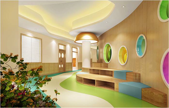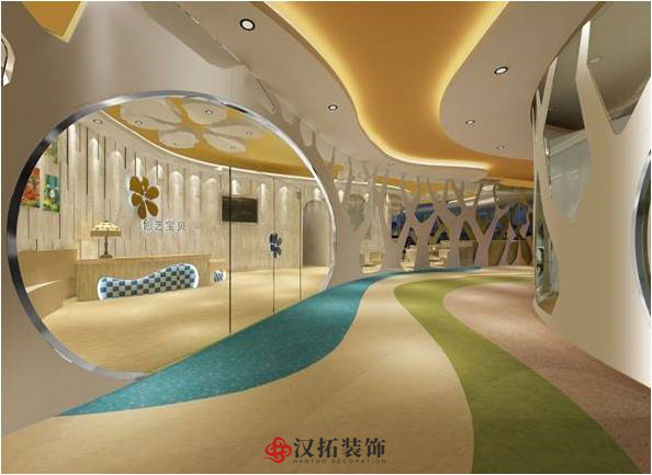 過(guò)道的設(shè)計(jì)突破傳統(tǒng),異形空間,給孩子神秘感,蜿蜒曲折讓孩子的探秘童心迸發(fā)出來(lái),地面地膠與頂面石膏板吊頂造型協(xié)調(diào)統(tǒng)一,使不規(guī)則的空間也顯得錯(cuò)落有致。