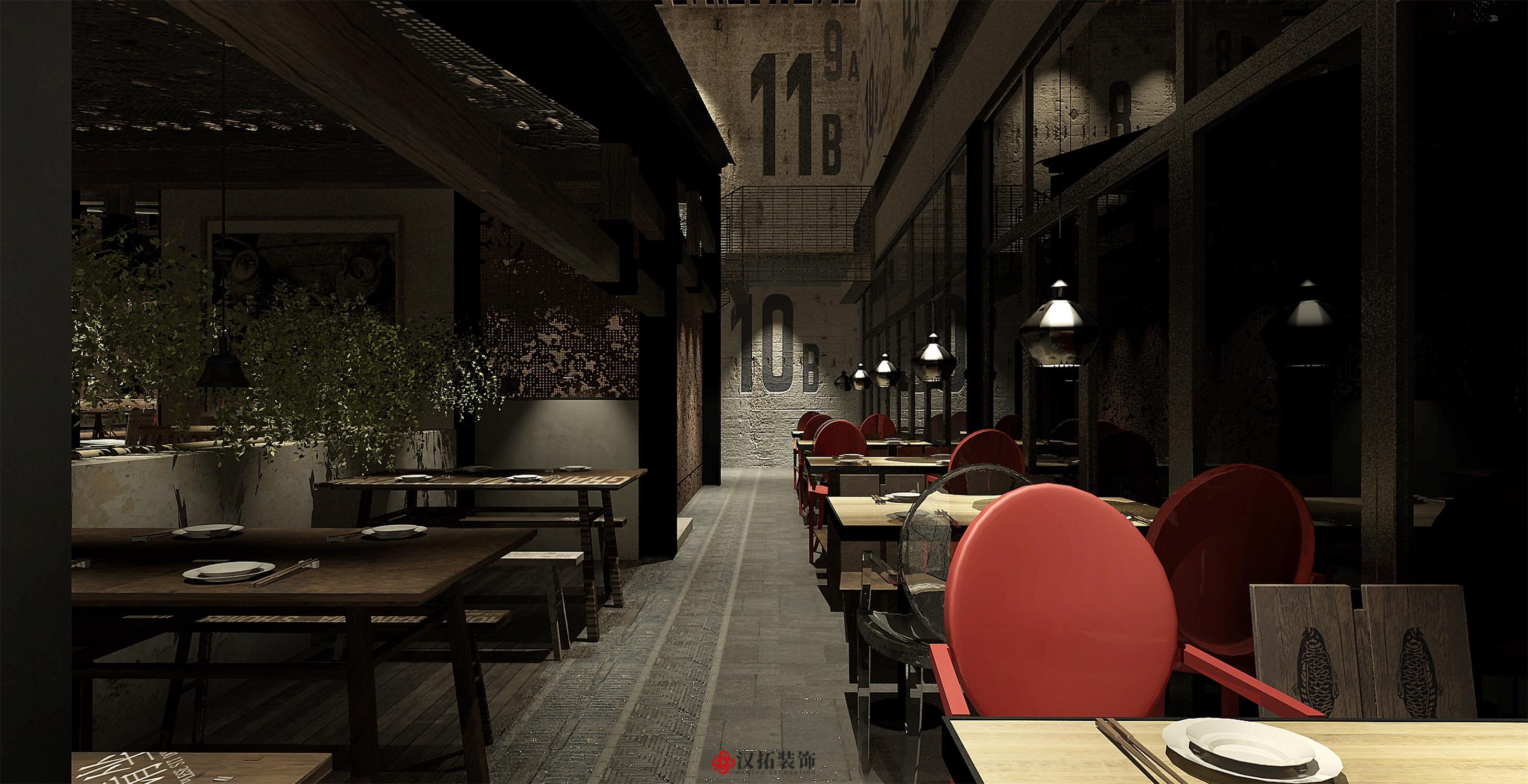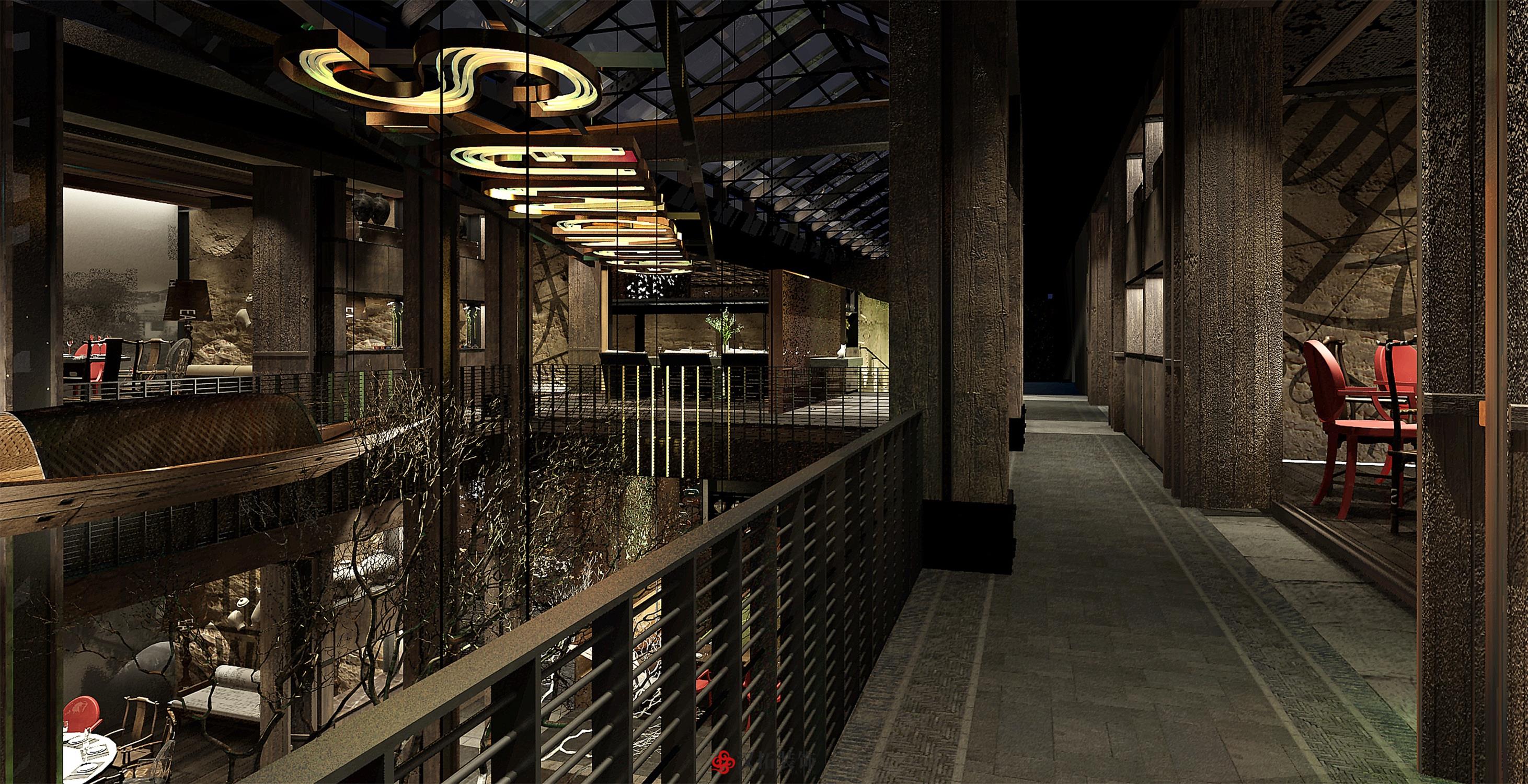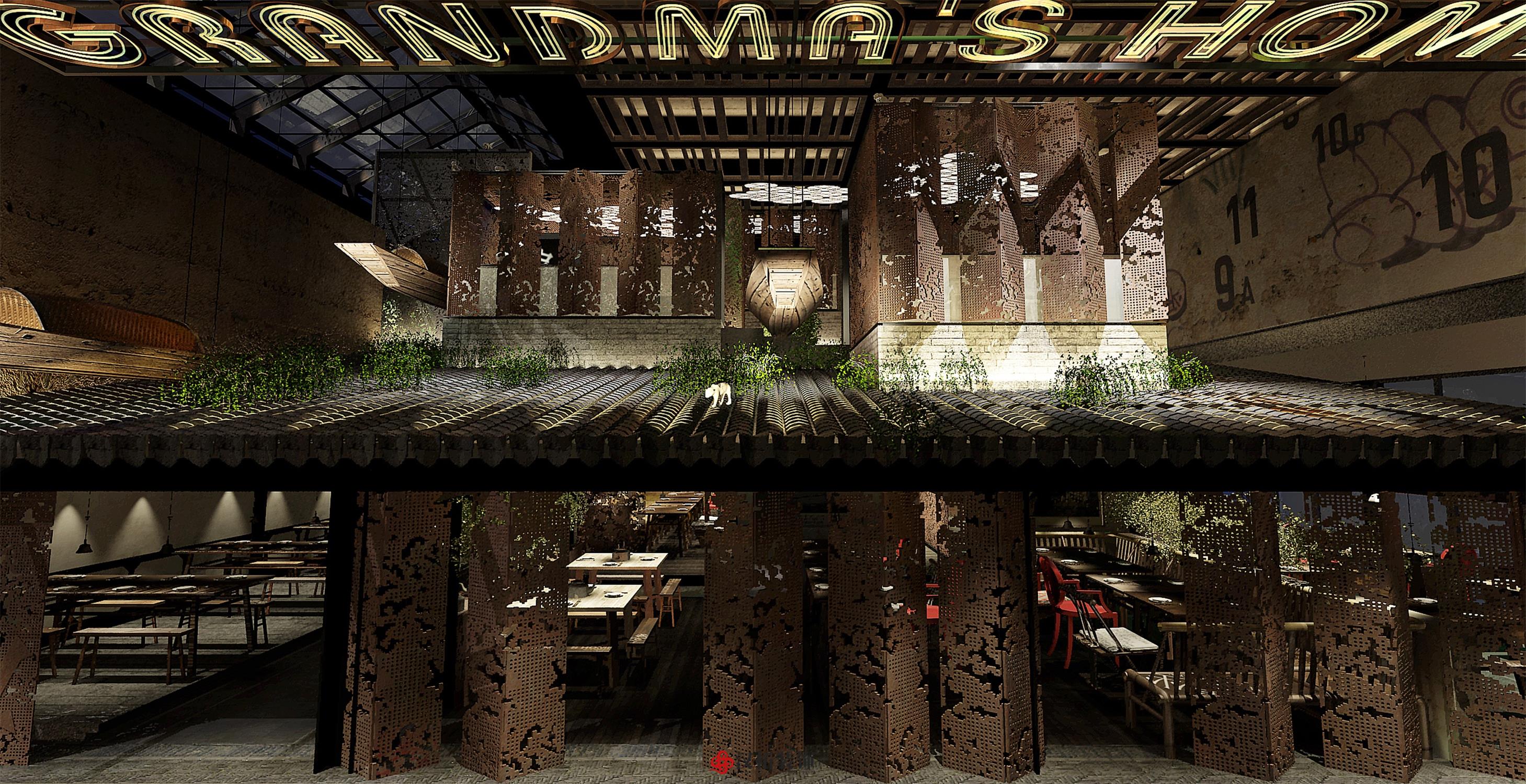 設計說明:以傳統的深色中式古董木桌為中心, 搭配長條板凳、扶手椅和小圓凳,座位周圍留有 充裕的空間以便上菜、敬酒時可自由走動。墻體 材質顏色以淺色為主,使周圍色調呈現出樸素和 溫馨感,地面鋪設深色木地板,配合偏暗的暖色 燈光,將古樸典雅的氣氛烘托出來